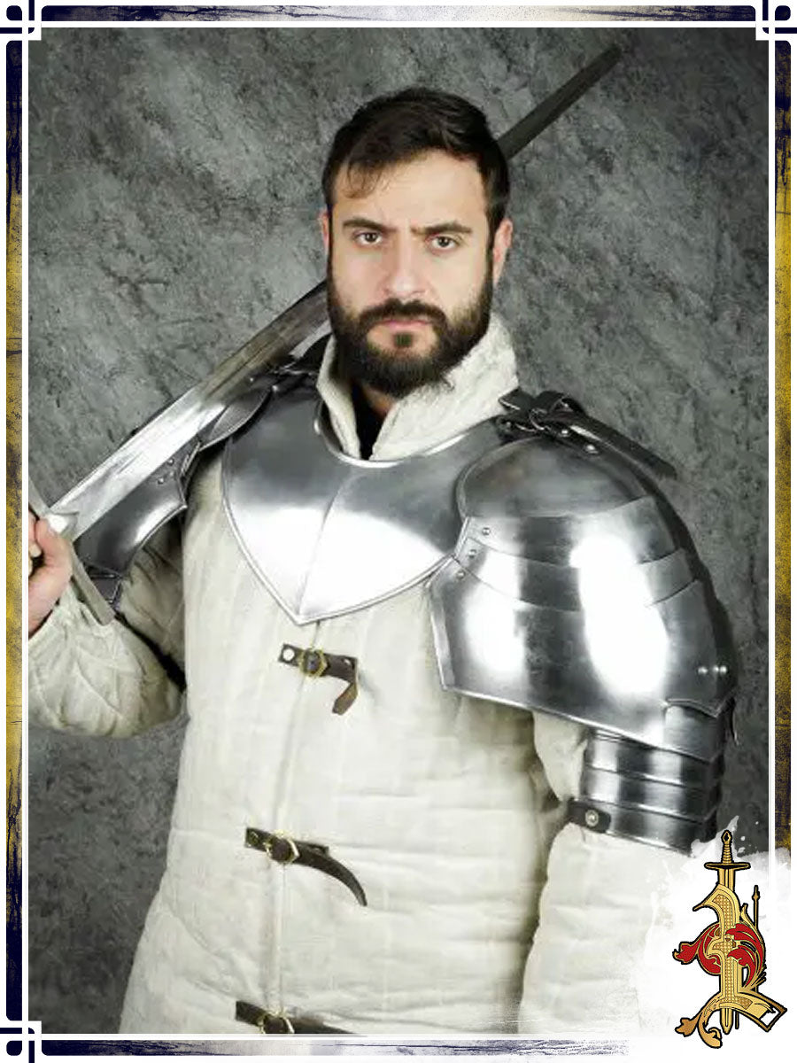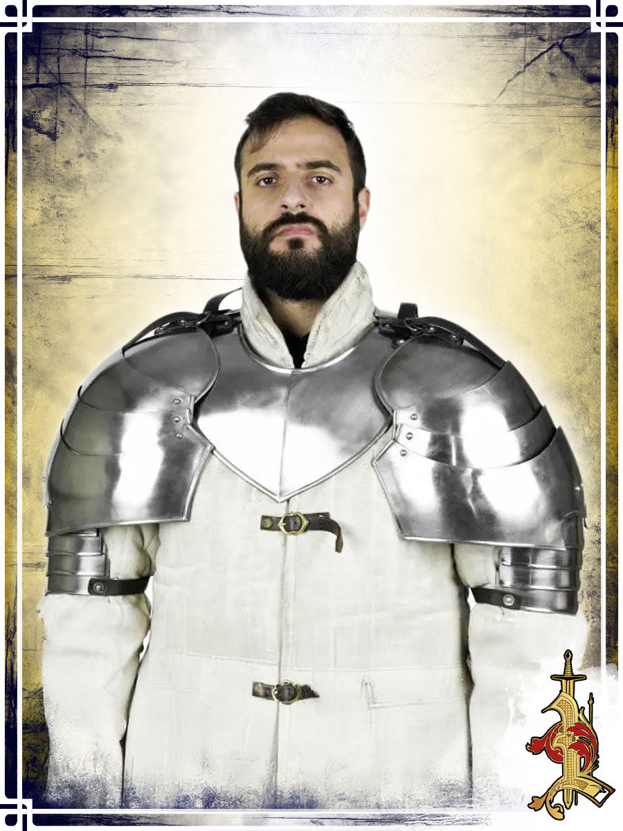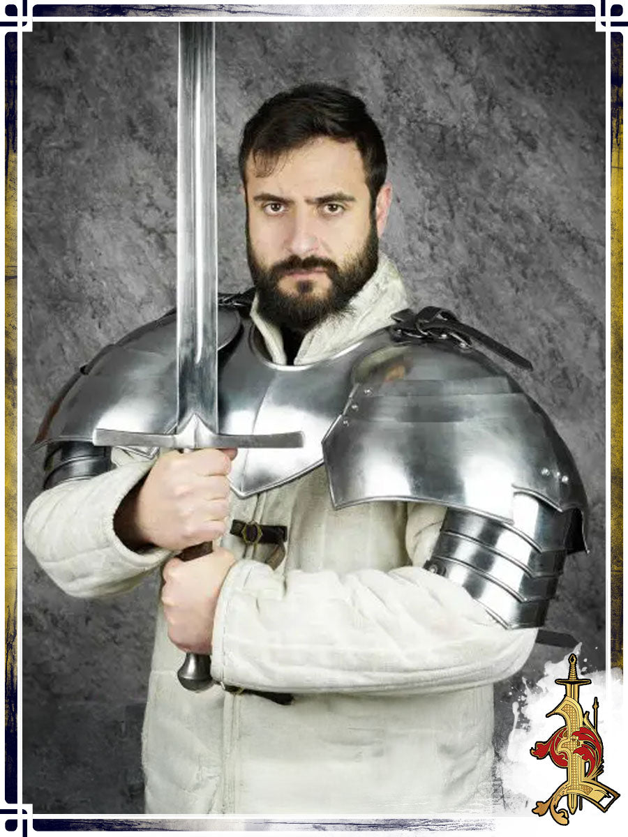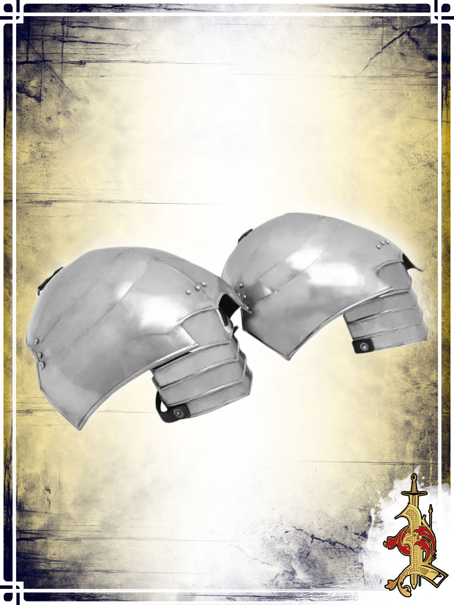 These elegant pauldrons are crafted from 18-gauge mild steel with a smooth, polished finish. Their discreet contour is designed for excellent maneuverability during fast-paced LARP combat and extended cosplay events. Measuring 16 inches long and 12 inches wide, they provide solid coverage without being cumbersome.