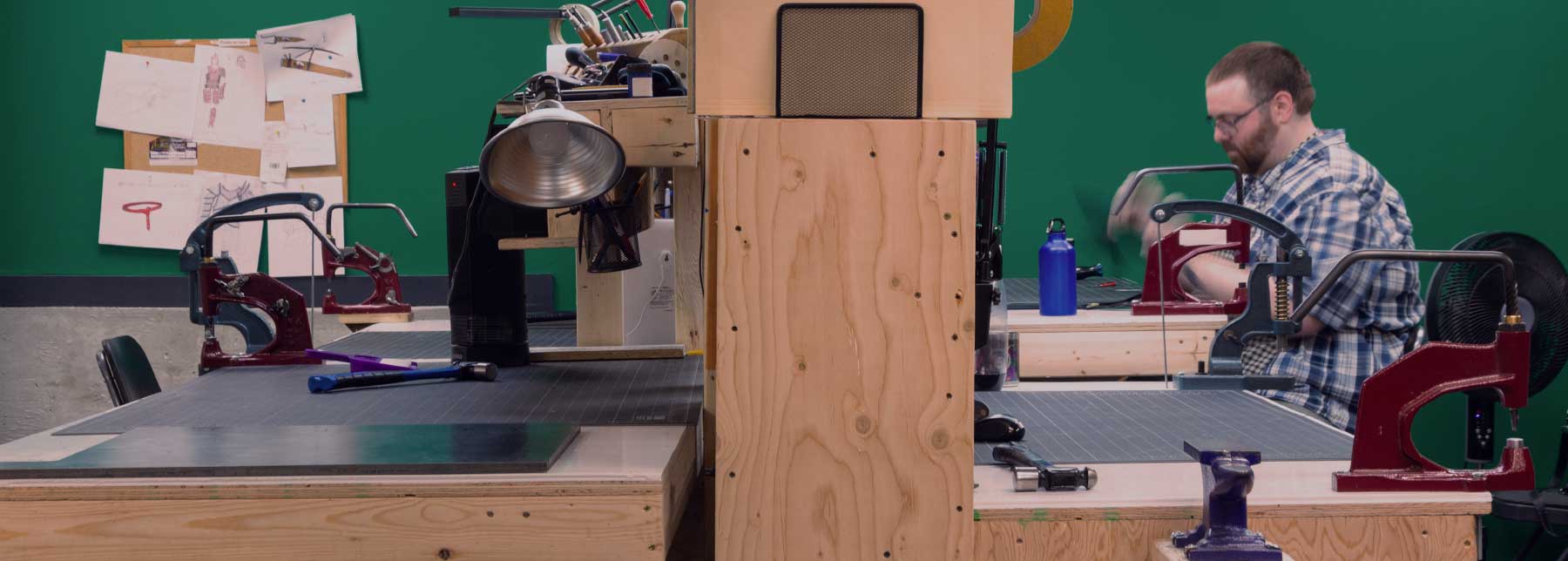- Access to equipment: Access to shared equipment, including a dye hood, hydraulic press, sanding table, and cutting tables.